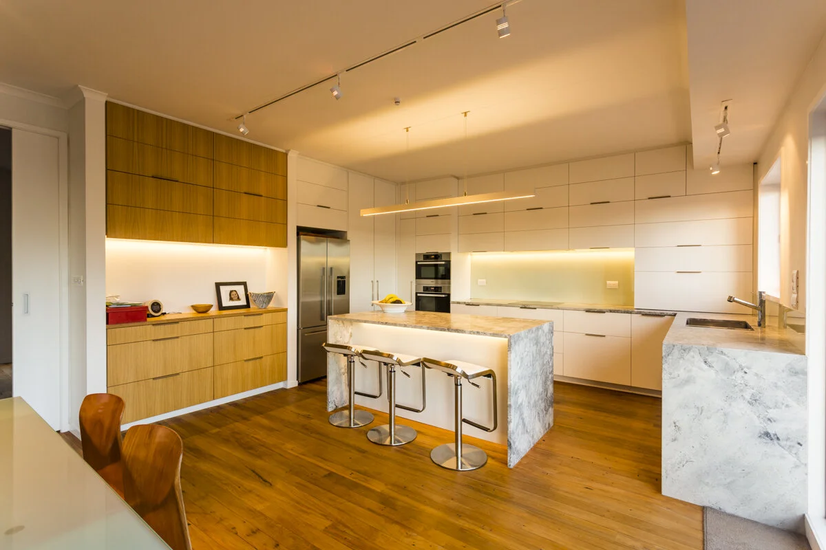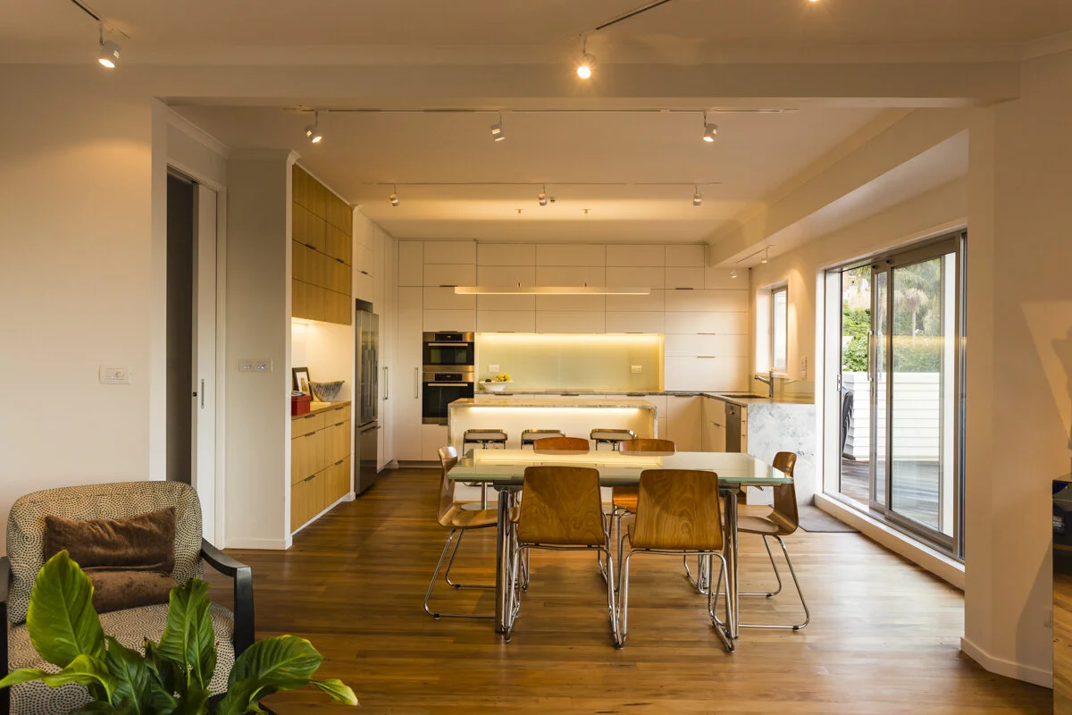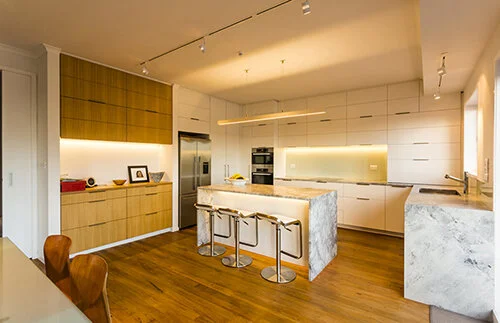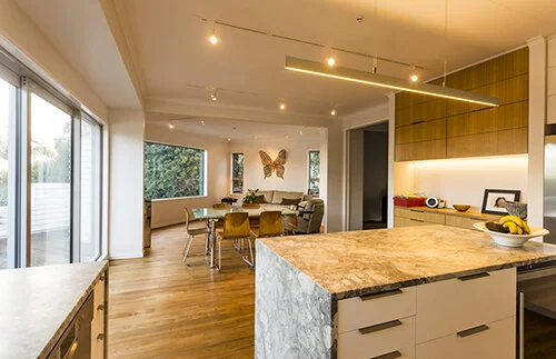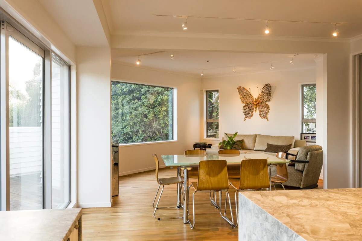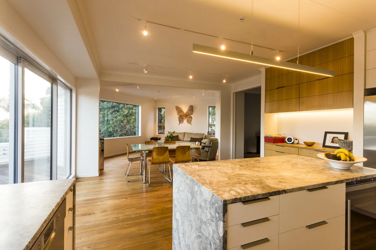 Utilising a cavity construction cladding system and modern double-glazed aluminium joinery, this partial rebuild involved significant structural upgrade and redesign with alteration to the internal living spaces enabling better flow and connection between the spaces. The reconfiguration provided for better space utilisation providing for a larger family kitchen and dining area brought forward to the north facing views and outdoor living area, with two living spaces being able to be divided off allowing the family to enjoy separation for adult and homework time with the creation of an additional study/home office area and connection to the rear outdoor garden.